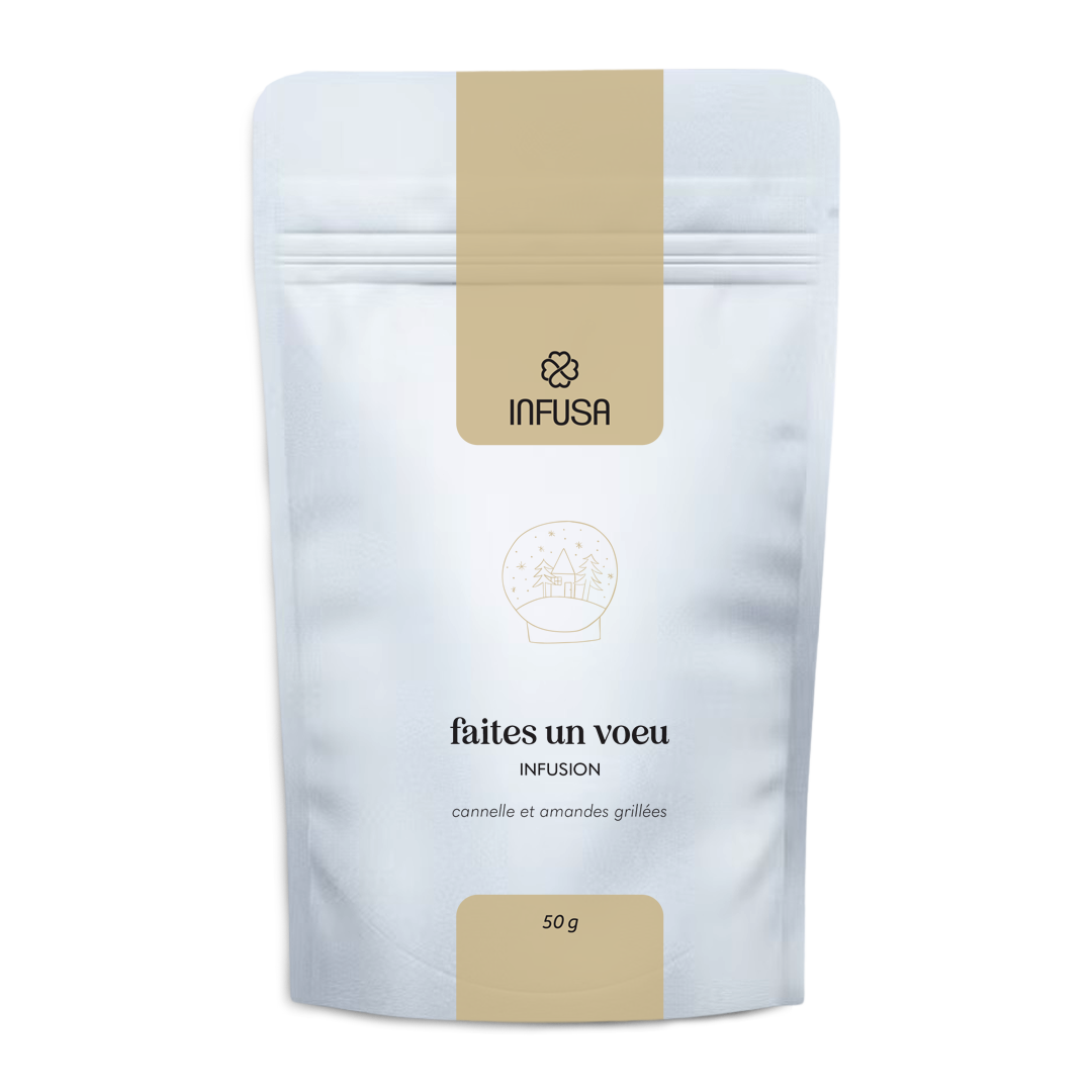 - Infusion aromatisée au goût de cannelle, amandes grillées, pomme, ananas sucré, écorce de séné, raisins de Corinthe huilés, pépins de citrouille grillés, chips de coco sucrés, flocons de framboise sucrés, feuille de rose rouge