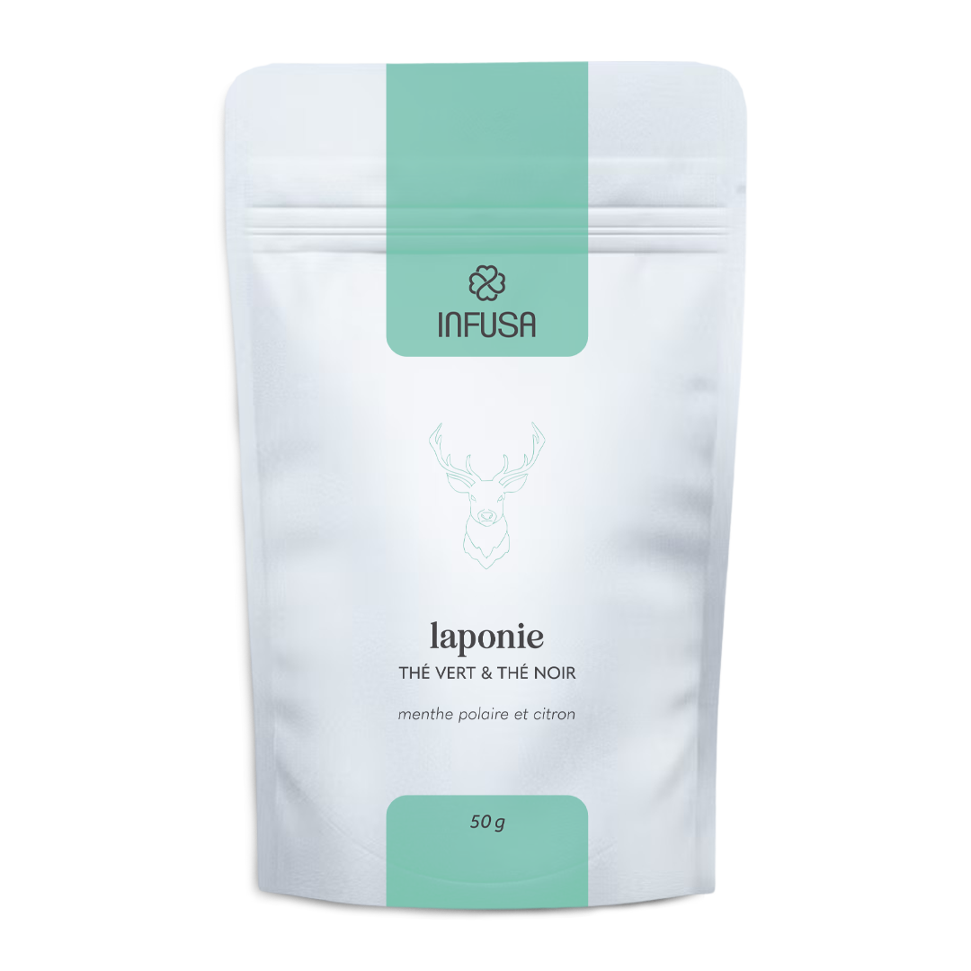 - Thé vert et thé noir aromatisés à la menthe polaire, citron, cristaux de glace en sucre*, mûre, bleuets blancs, feuilles de buchu. (*contient de l'huile d'arachide)